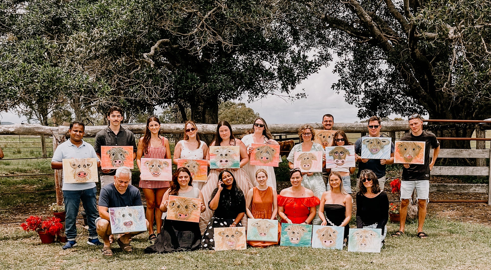 Immerse yourself in a delightful fusion of creativity and countryside charm with our Highland experiences! Set against the stunning backdrop of fig trees, this unique event invites you to unwind, sip on sparkling cuvee, and create your own masterpiece while surrounded by the gentle presence of Highland cows.